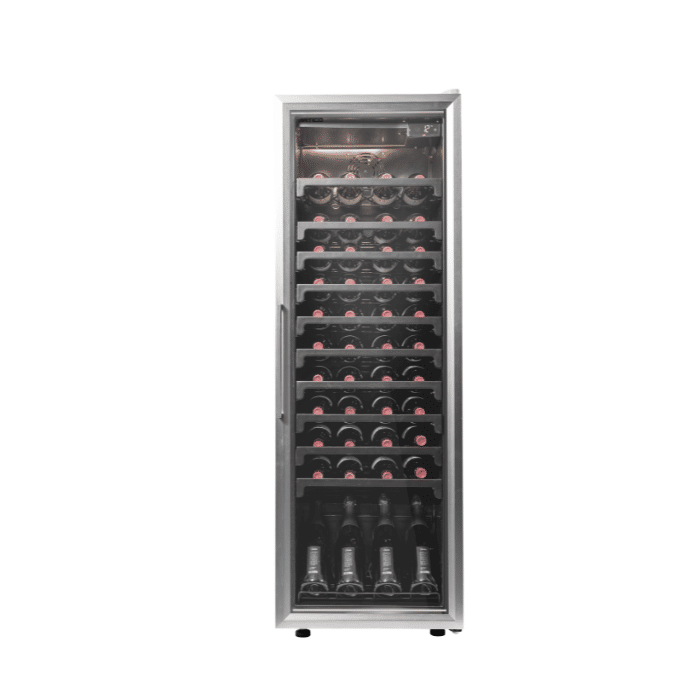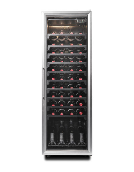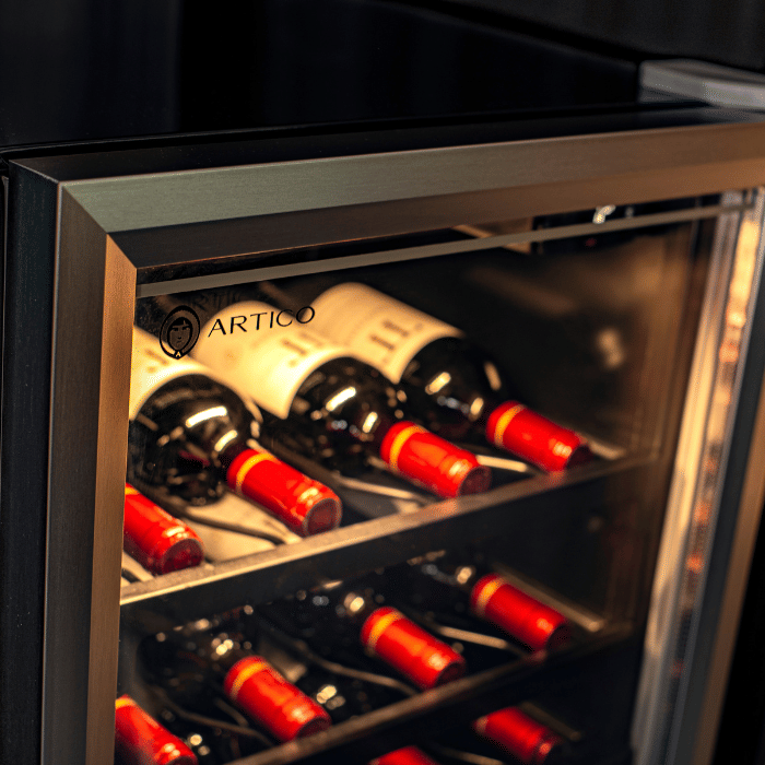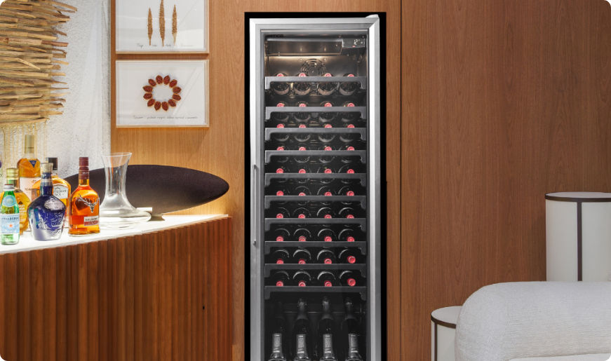 A adega possui capacidade para 45 garrafas, conta com prateleiras aramadas com corrediças em inox e sistema anti-vibração, além de prateleira inclinada para expor rótulos ou armazenar vinhos abertos.