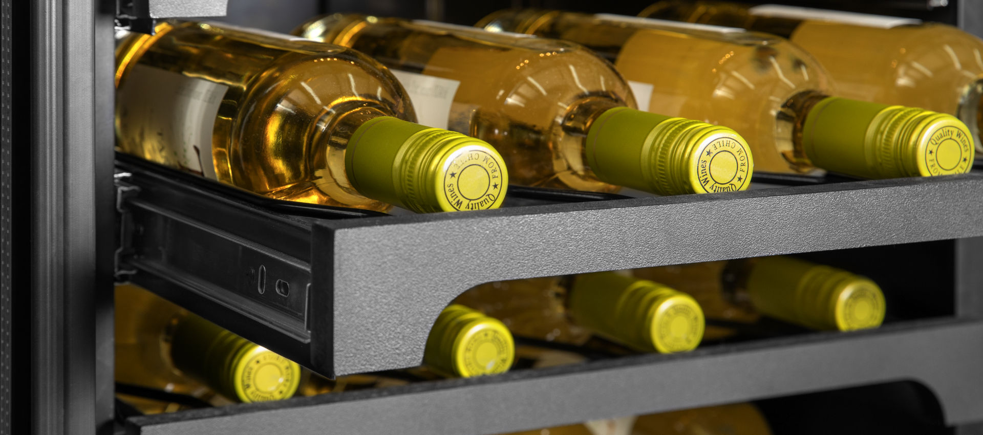 Prateleiras Inteligentes: As prateleiras com design aramado acolhem perfeitamente todos os tipos de garrafas, evitando danos aos rótulos, enquanto as corrediças telescópicas em inox e o sistema de travas anti-vibração garantem segurança e acessibilidade da sua adega.