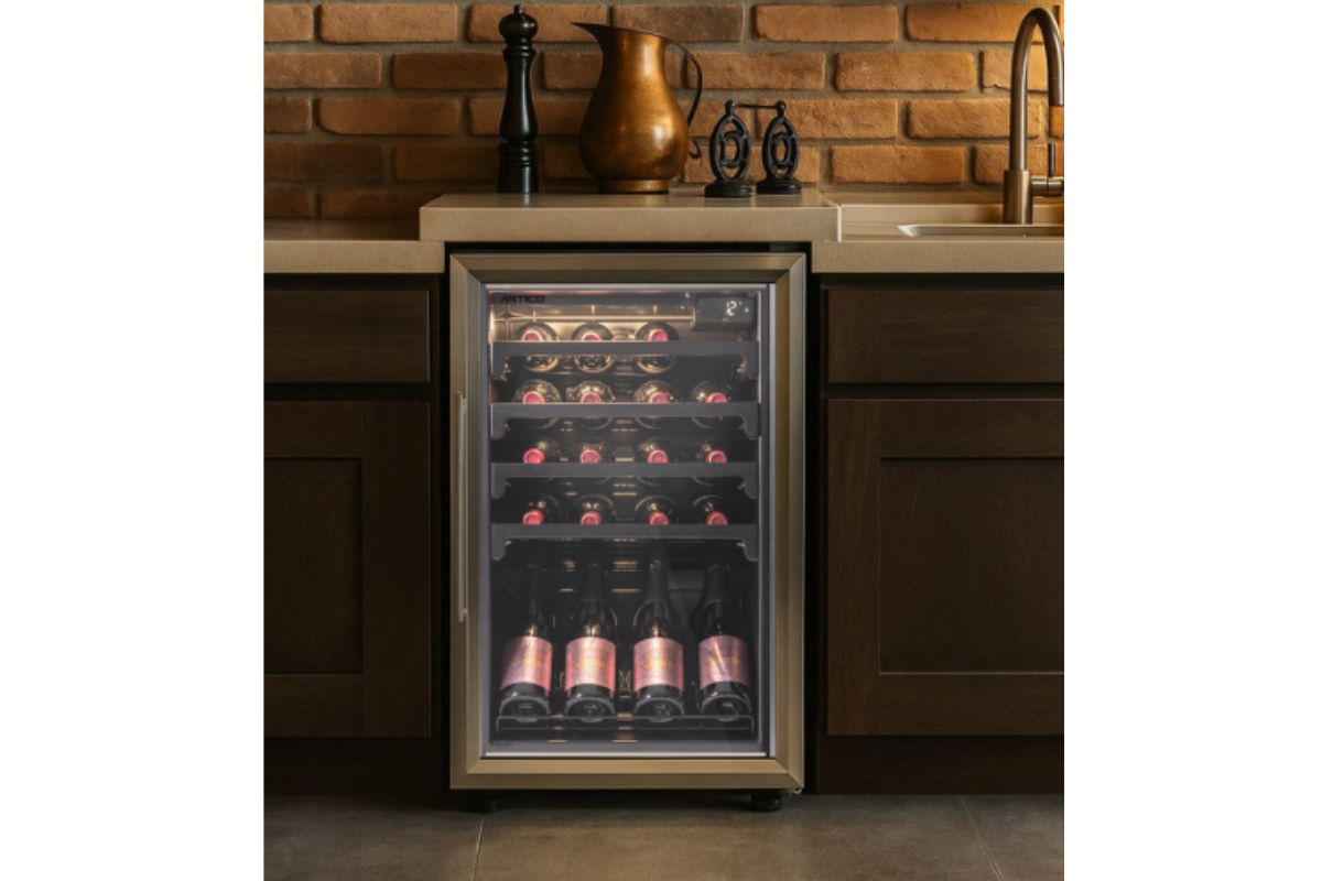 Refrigeração por Ar Forçado: O sistema de refrigeração por compressor assegura uma temperatura uniforme em todo o interior da adega, preservando a qualidade dos seus rótulos de vinhos.